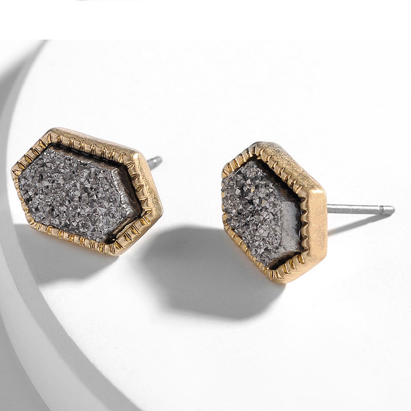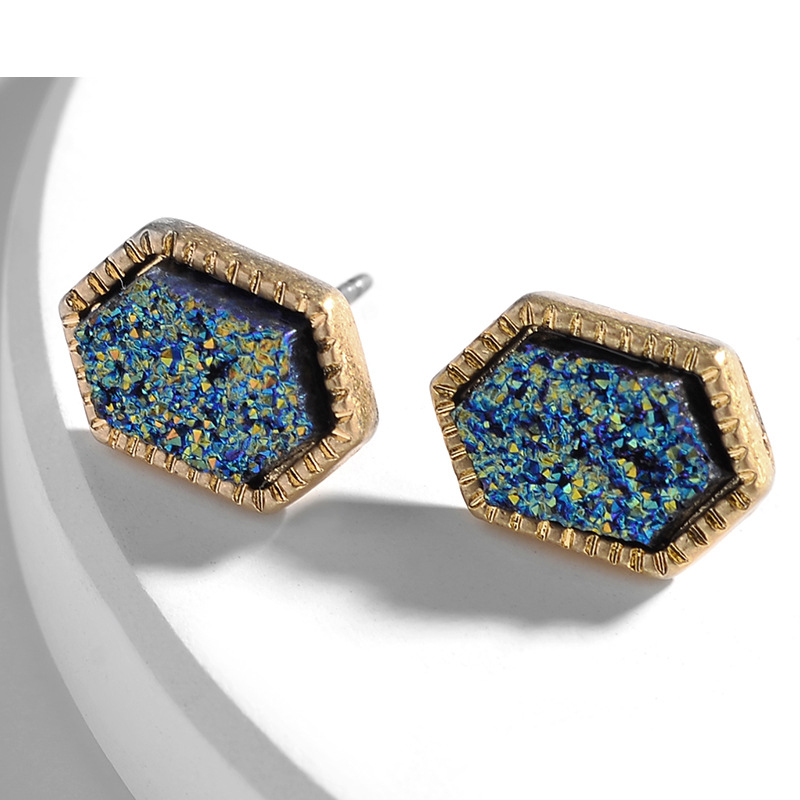 Pretty Cute Druzy Crystal hexagon Prism Stud Earrings Set for Women Girl Fashion Delicate Pierced Jewelry